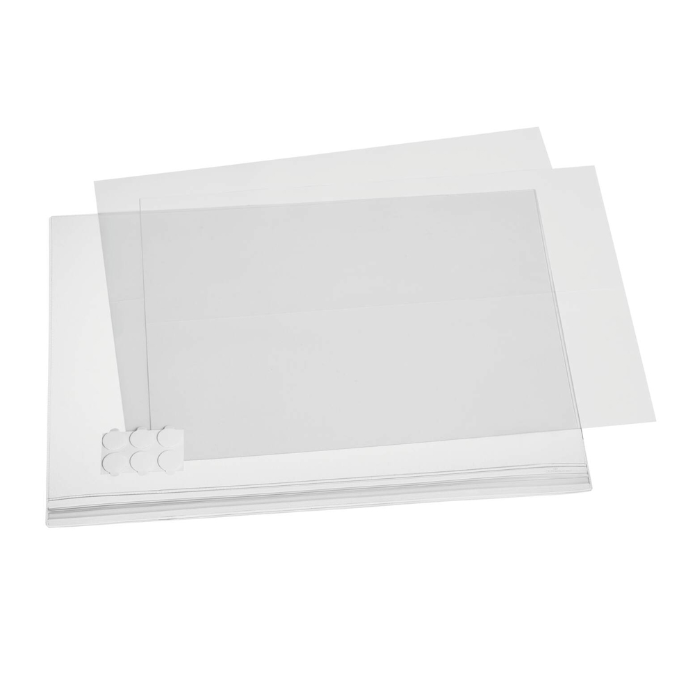 Fixe o bolso do expositor como quiser, utilizando as quatro almofadas autocolantes altamente transparentes (incluídas), que podem ser removidas sem deixar resíduos